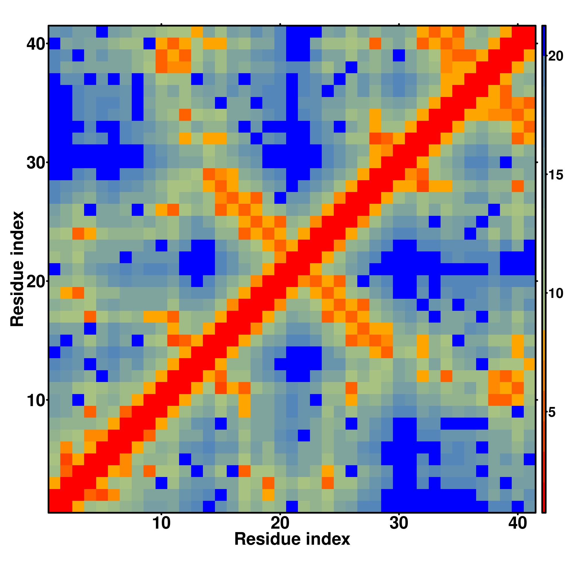 while for the distance map and hydrogen bond network, a color scale represents a distance of 1-20+ angstroms or a angle of 0-180 degree.