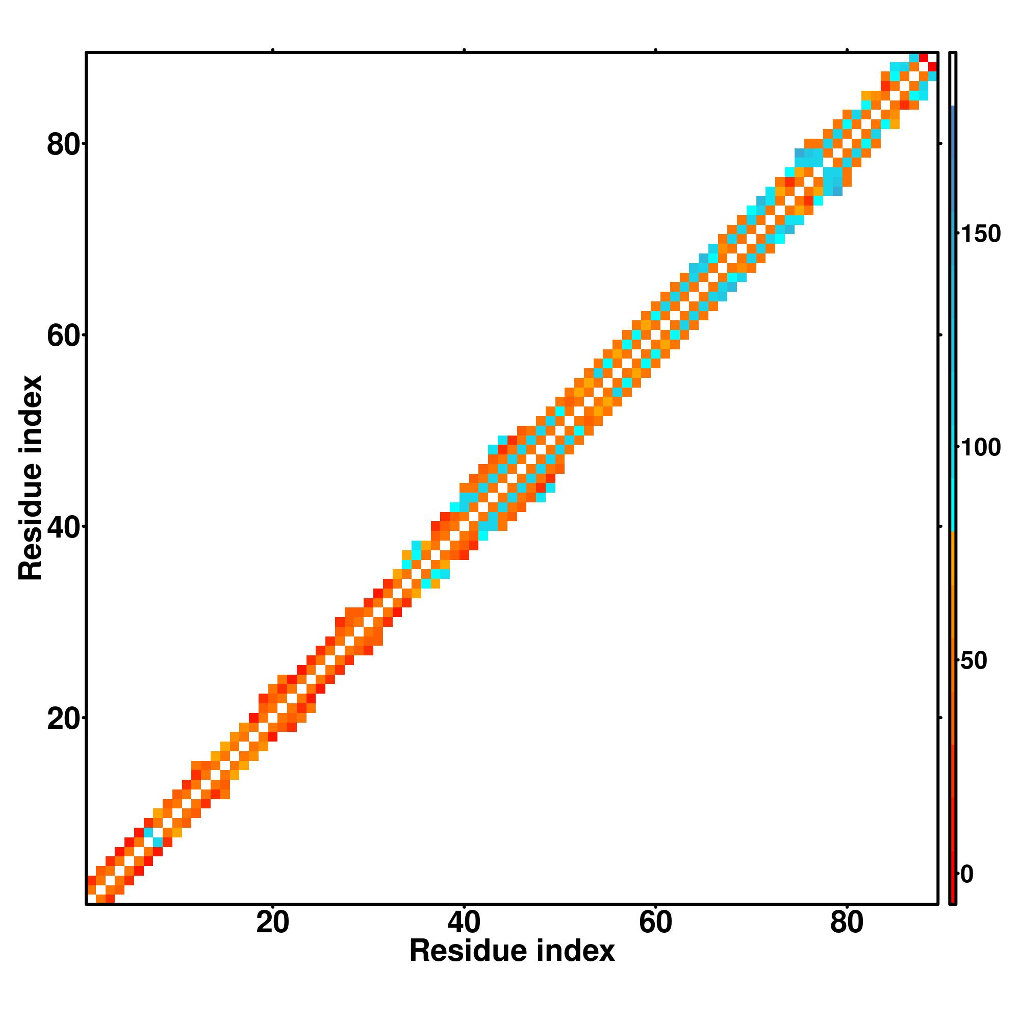 while for the distance map and hydrogen bond network, a color scale represents a distance of 1-20+ angstroms or a angle of 0-180 degree.