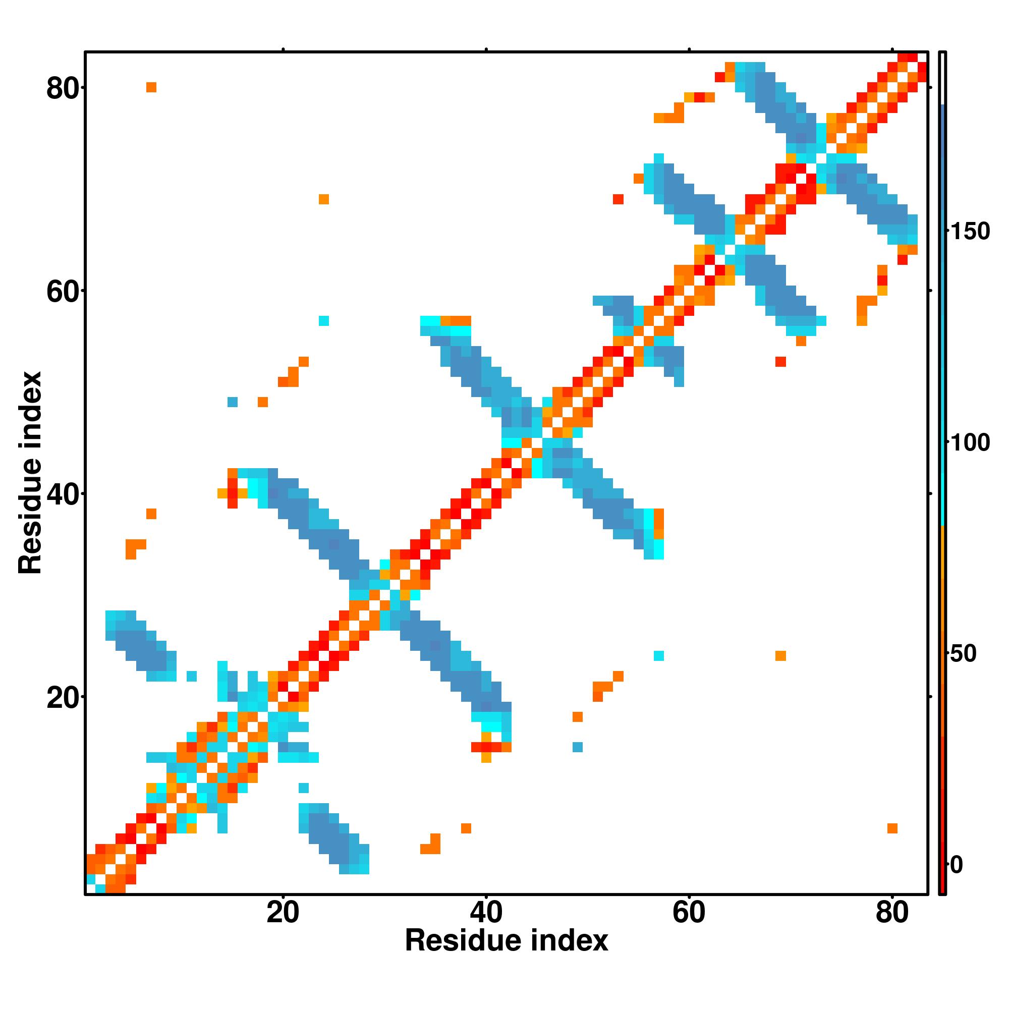 while for the distance map and hydrogen bond network, a color scale represents a distance of 1-20+ angstroms or a angle of 0-180 degree.