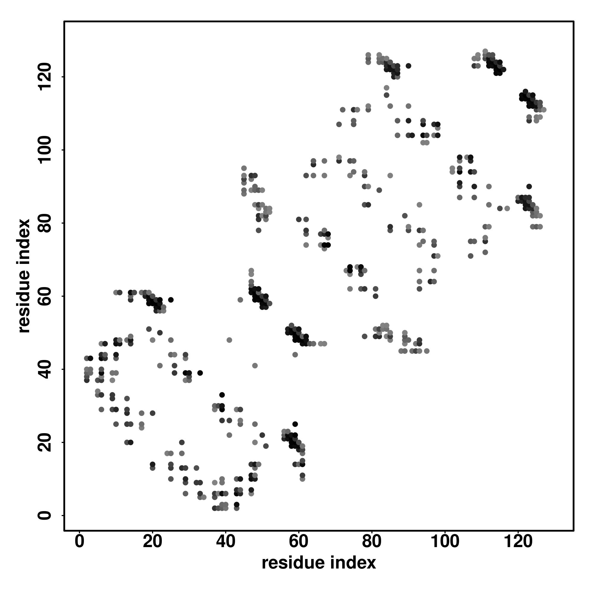 For the contact map, each dot represents a residue pair with predicted contact,