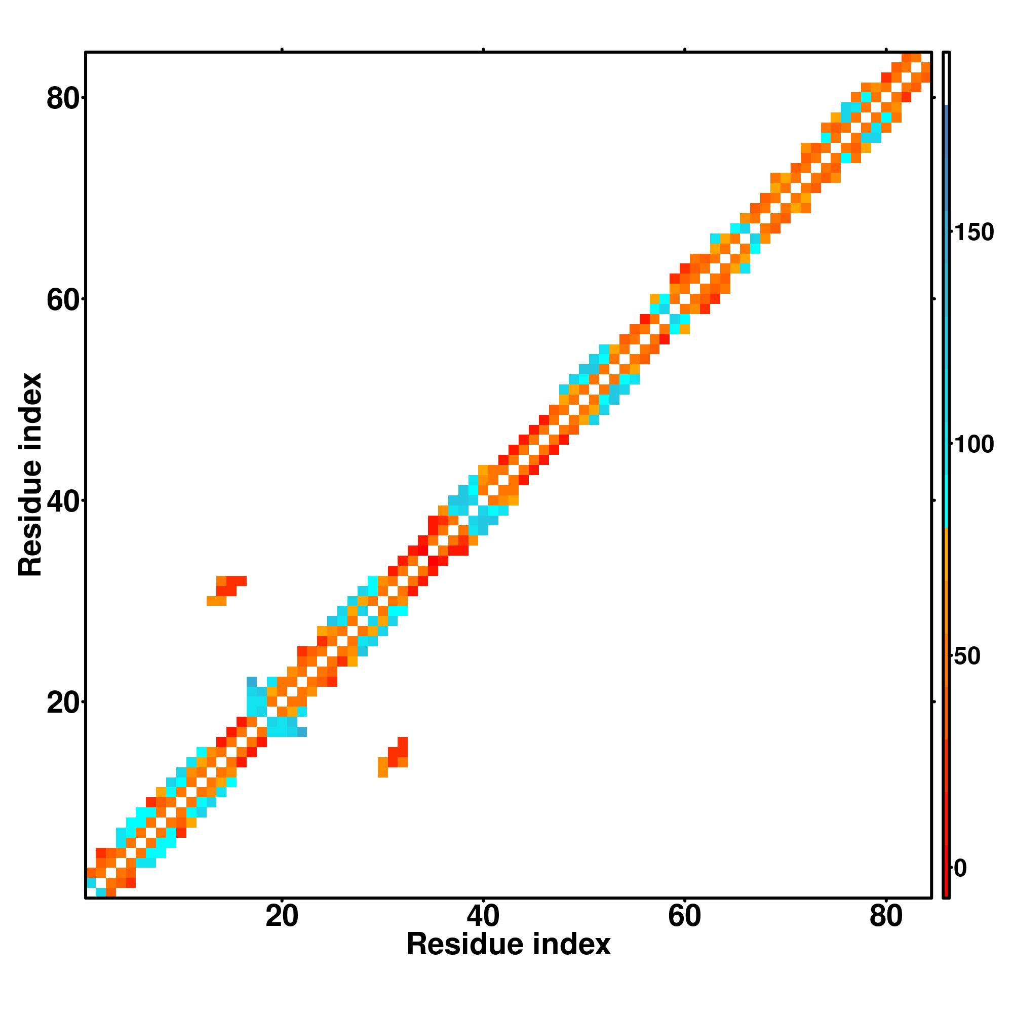 while for the distance map and hydrogen bond network, a color scale represents a distance of 1-20+ angstroms or a angle of 0-180 degree.
