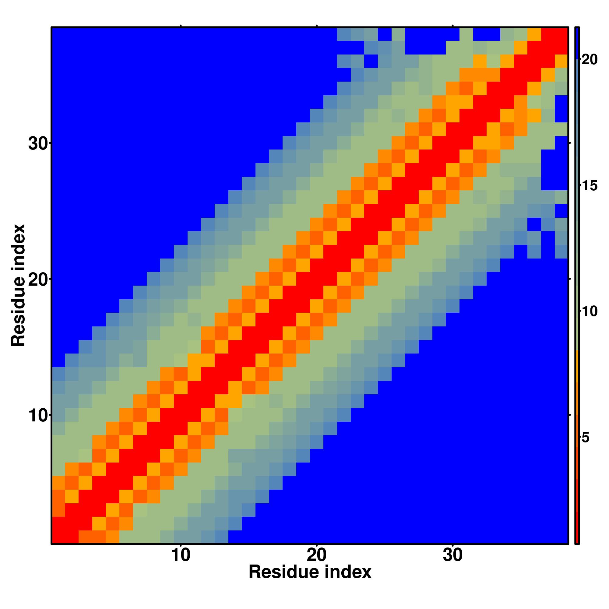 while for the distance map and hydrogen bond network, a color scale represents a distance of 1-20+ angstroms or a angle of 0-180 degree.