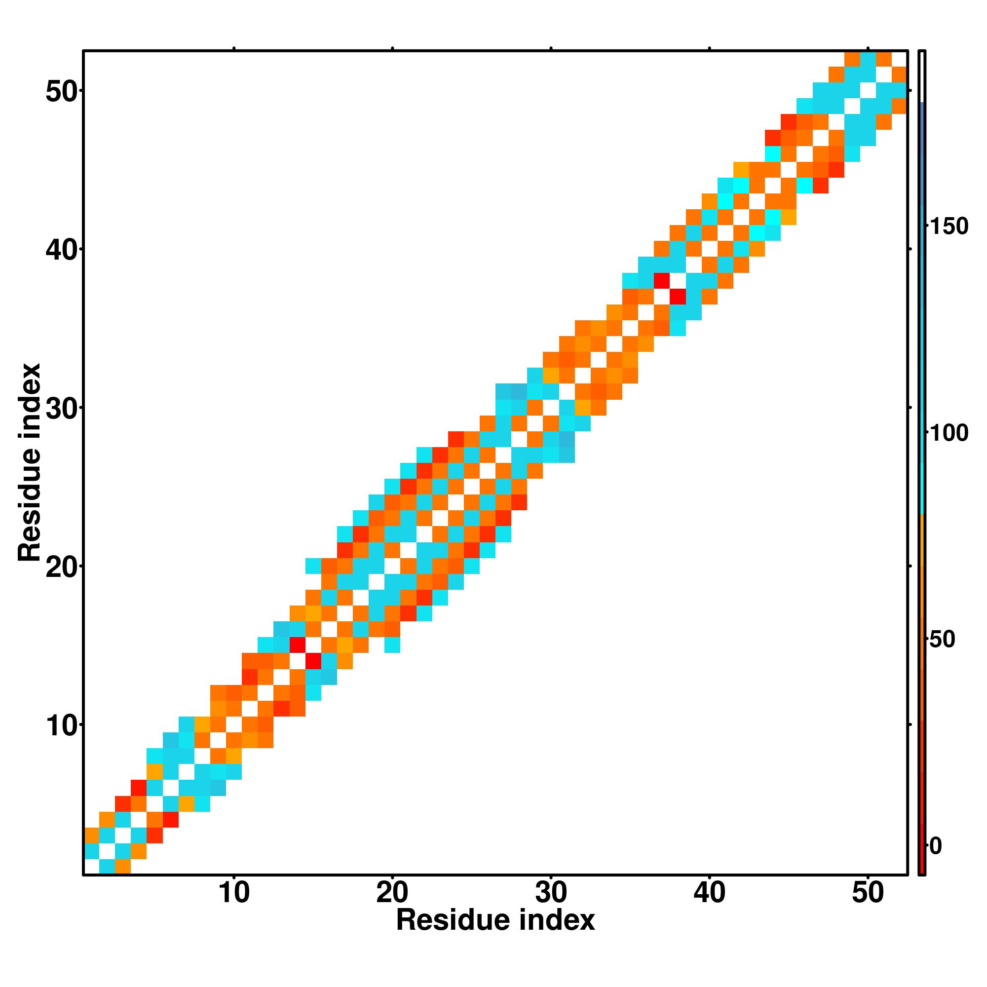 while for the distance map and hydrogen bond network, a color scale represents a distance of 1-20+ angstroms or a angle of 0-180 degree.