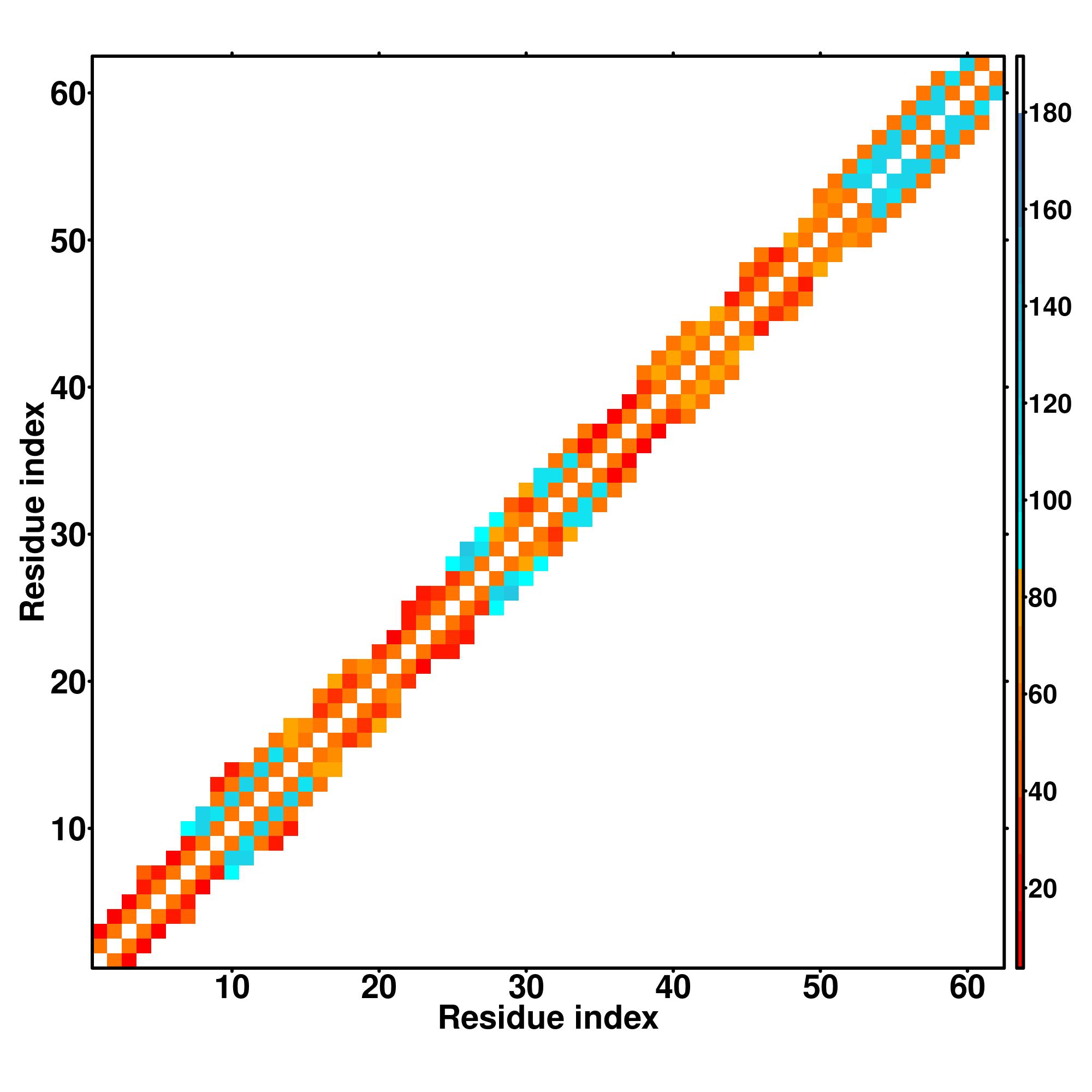 while for the distance map and hydrogen bond network, a color scale represents a distance of 1-20+ angstroms or a angle of 0-180 degree.