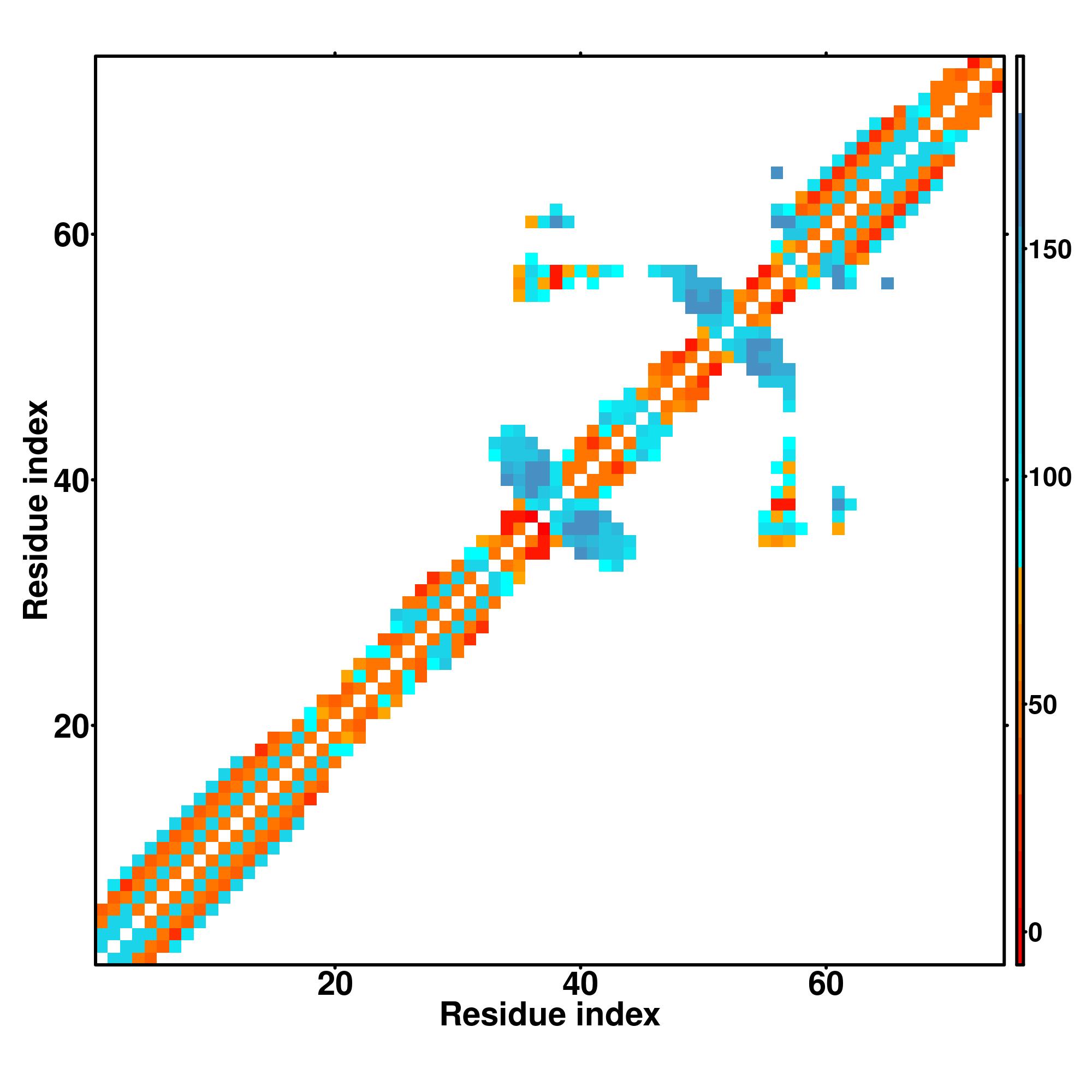 while for the distance map and hydrogen bond network, a color scale represents a distance of 1-20+ angstroms or a angle of 0-180 degree.