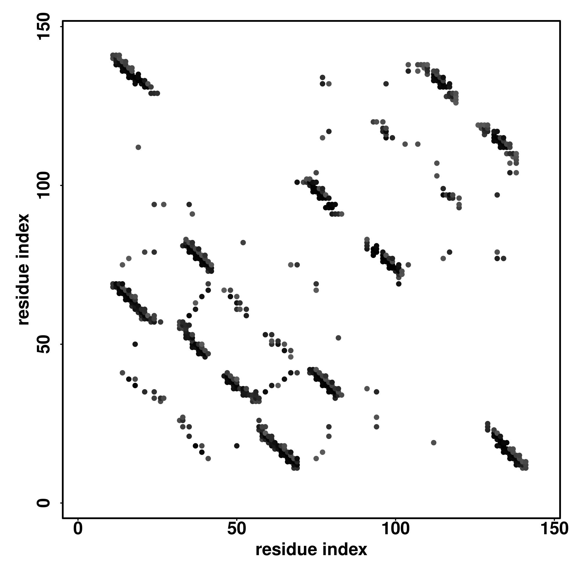 For the contact map, each dot represents a residue pair with predicted contact,