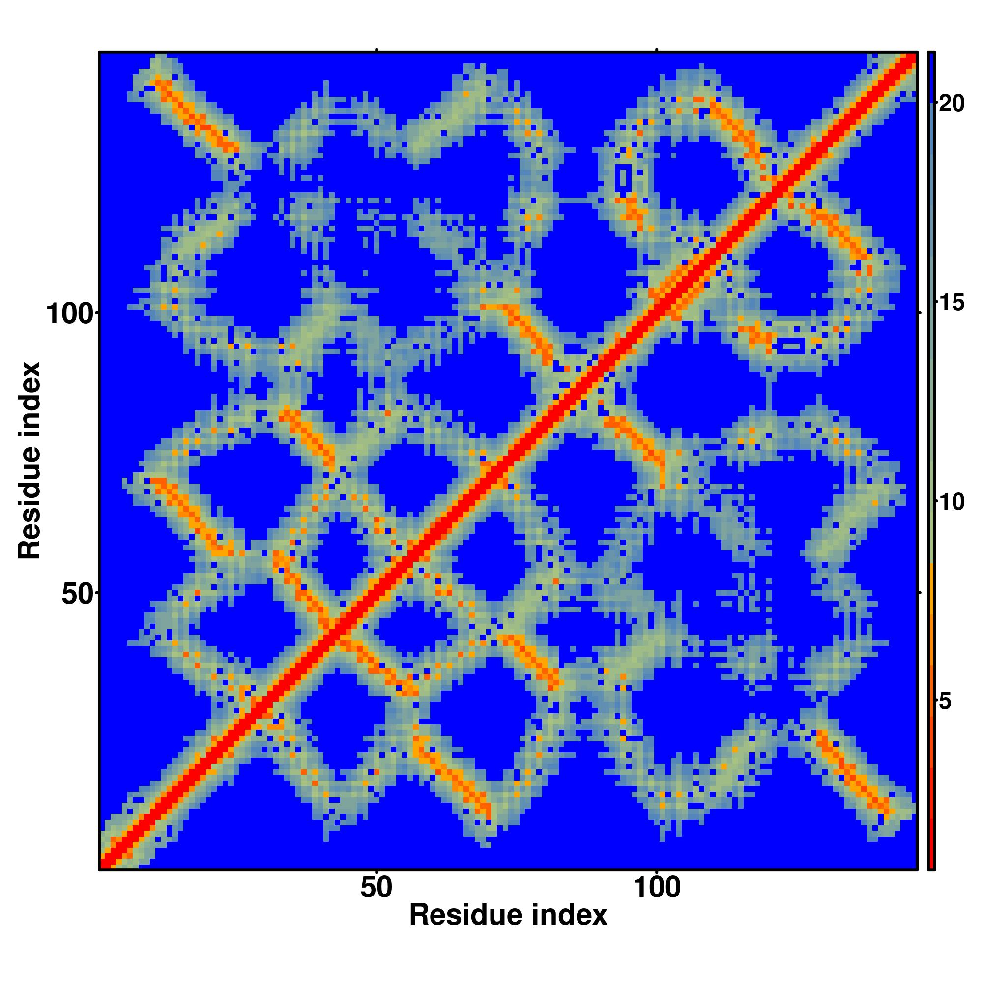 In the contact, distance map and hydrogen bond networks, the axes mark the residue index along the sequence.