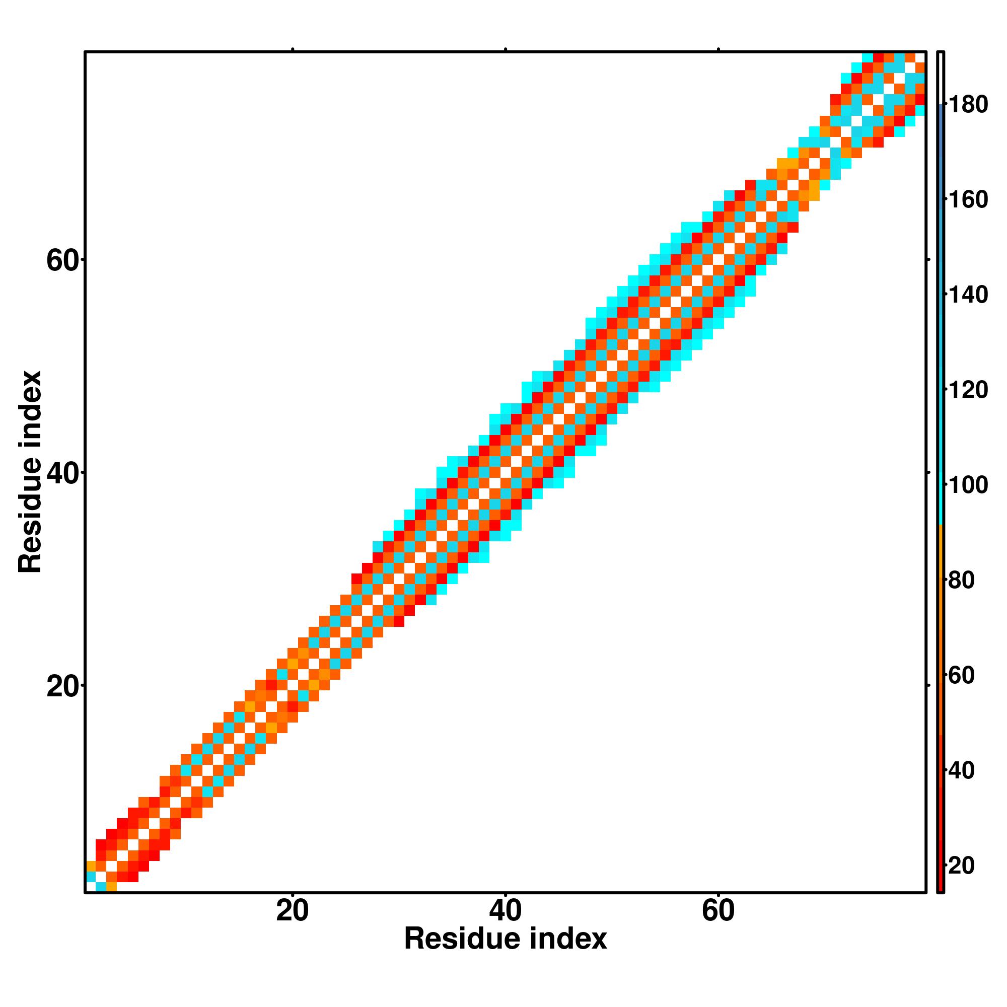 while for the distance map and hydrogen bond network, a color scale represents a distance of 1-20+ angstroms or a angle of 0-180 degree.