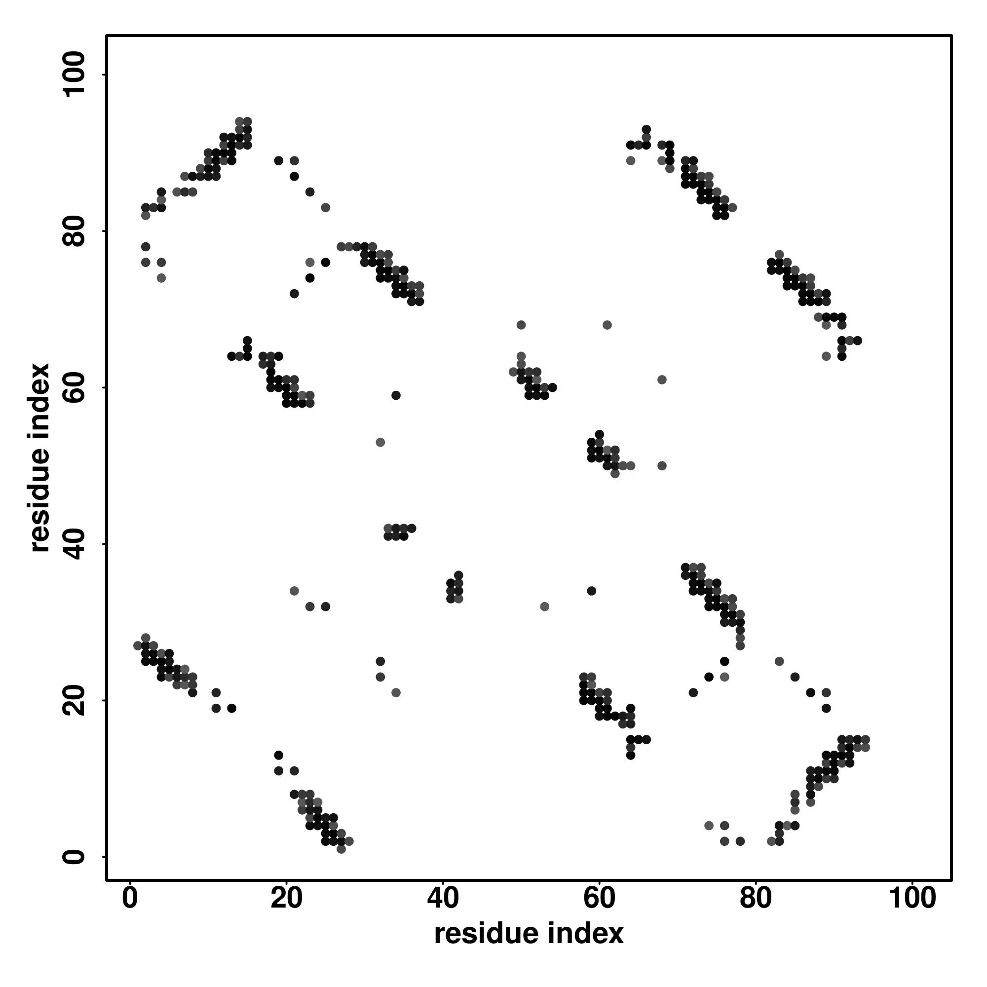 For the contact map, each dot represents a residue pair with predicted contact,