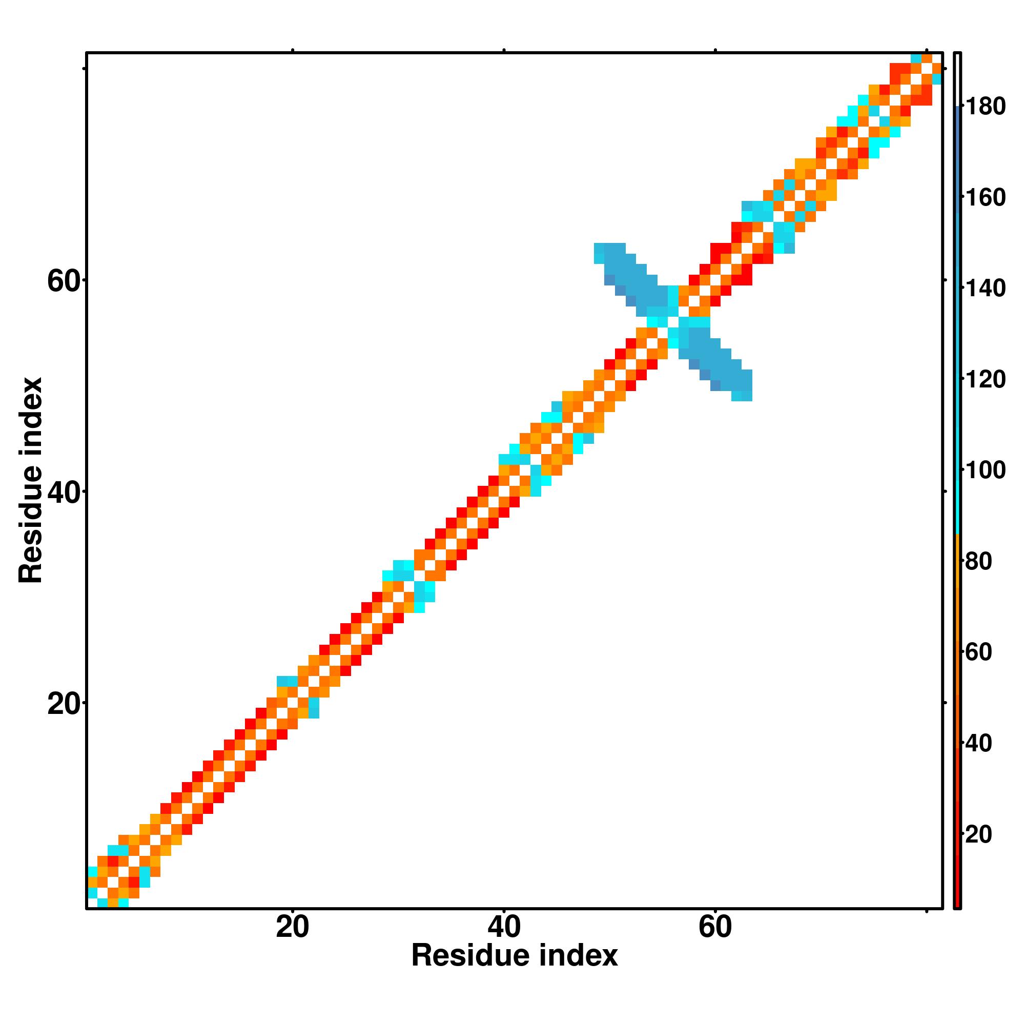while for the distance map and hydrogen bond network, a color scale represents a distance of 1-20+ angstroms or a angle of 0-180 degree.