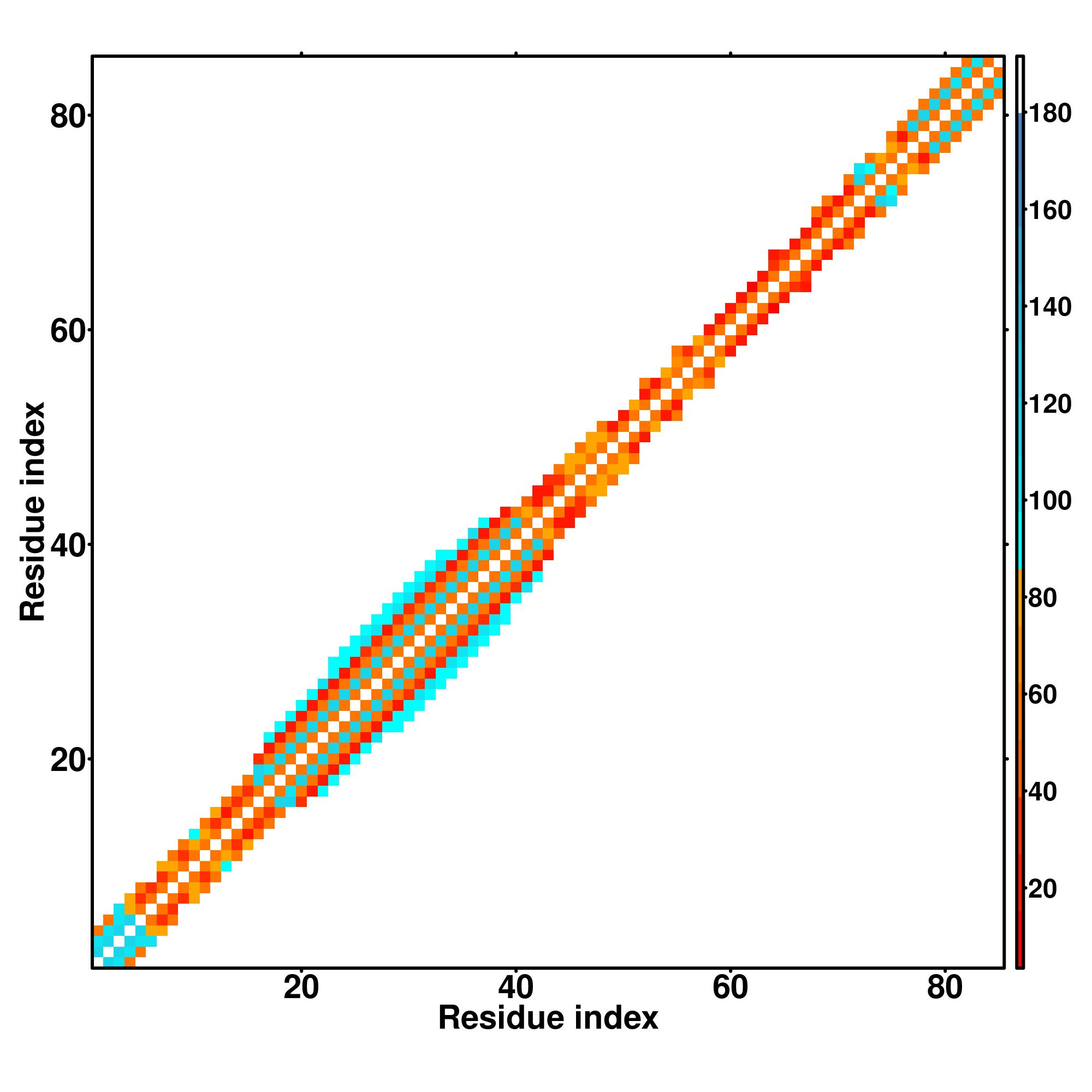 while for the distance map and hydrogen bond network, a color scale represents a distance of 1-20+ angstroms or a angle of 0-180 degree.