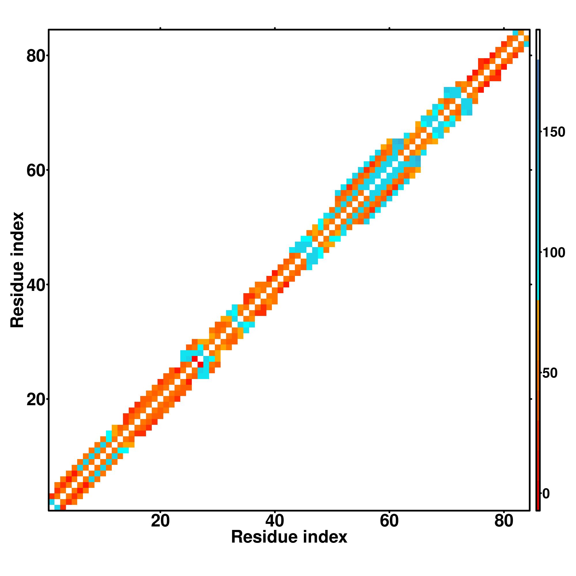 while for the distance map and hydrogen bond network, a color scale represents a distance of 1-20+ angstroms or a angle of 0-180 degree.