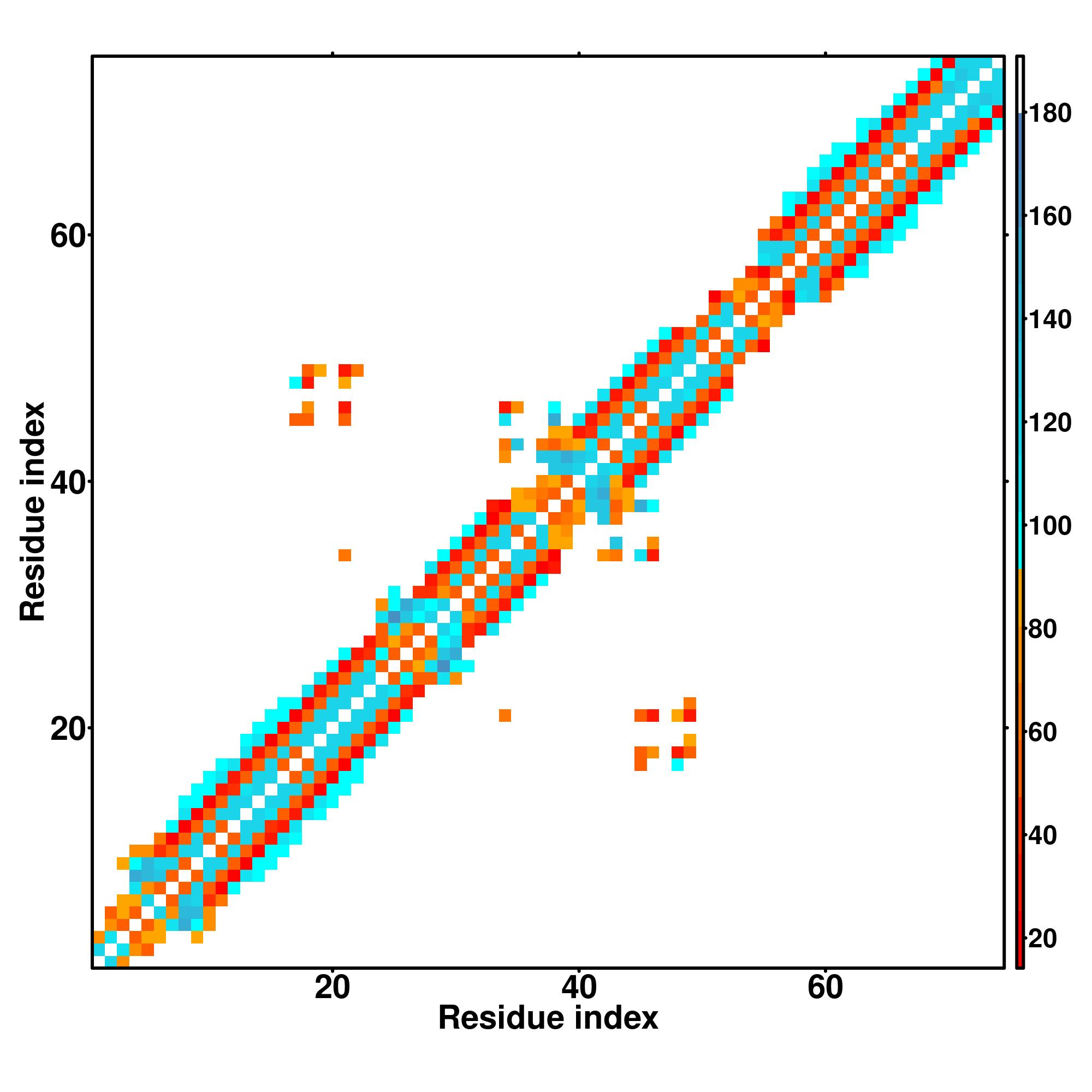 while for the distance map and hydrogen bond network, a color scale represents a distance of 1-20+ angstroms or a angle of 0-180 degree.