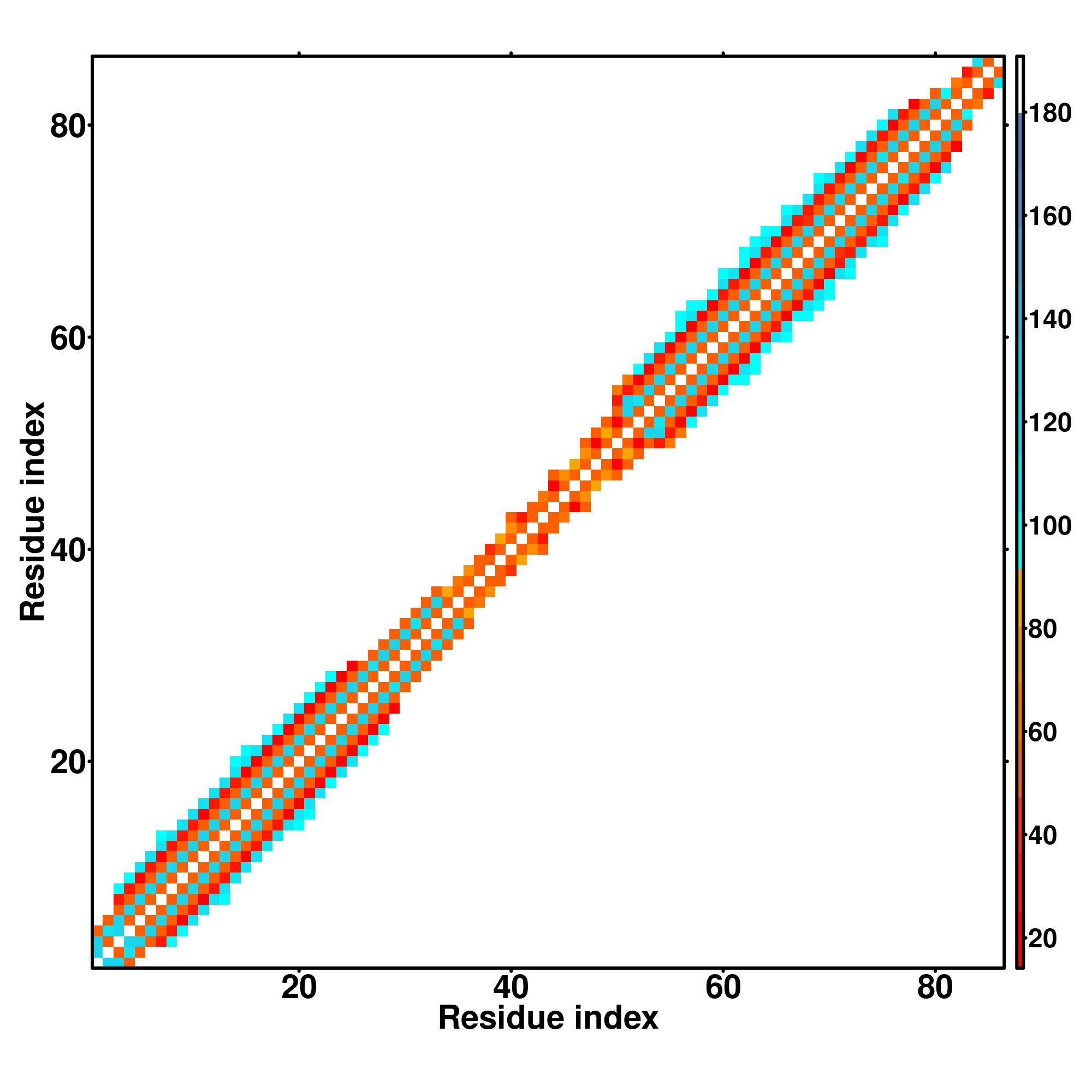 while for the distance map and hydrogen bond network, a color scale represents a distance of 1-20+ angstroms or a angle of 0-180 degree.
