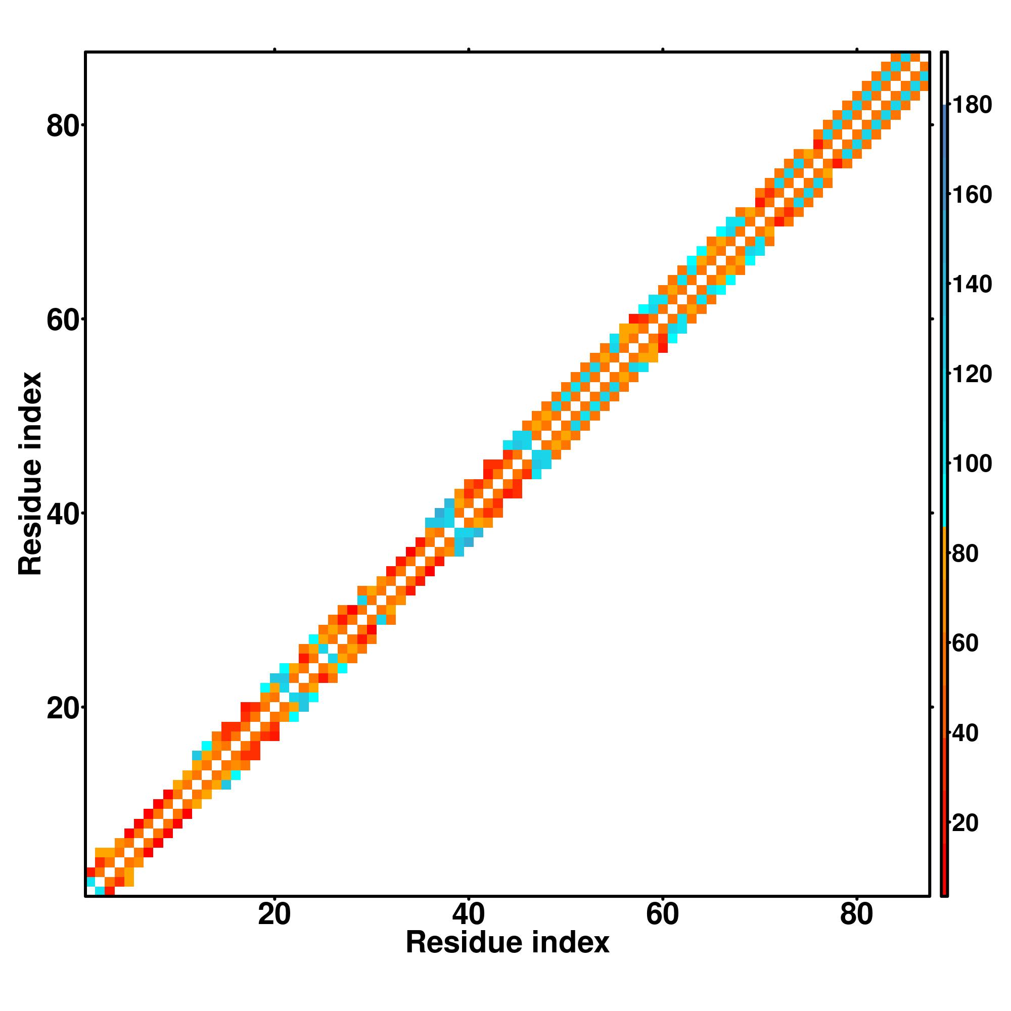 while for the distance map and hydrogen bond network, a color scale represents a distance of 1-20+ angstroms or a angle of 0-180 degree.