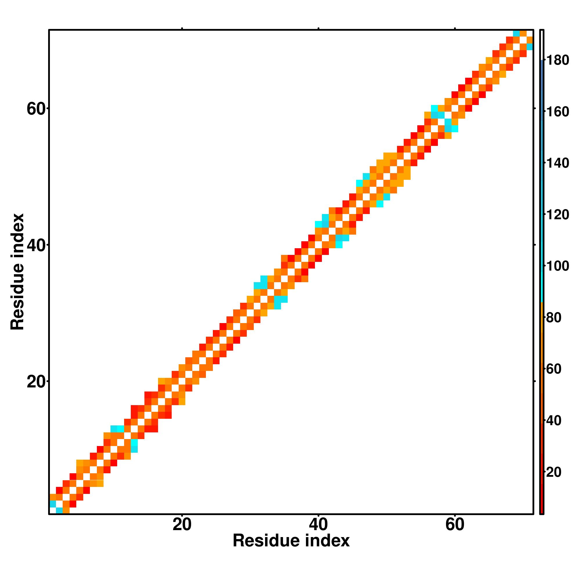 while for the distance map and hydrogen bond network, a color scale represents a distance of 1-20+ angstroms or a angle of 0-180 degree.