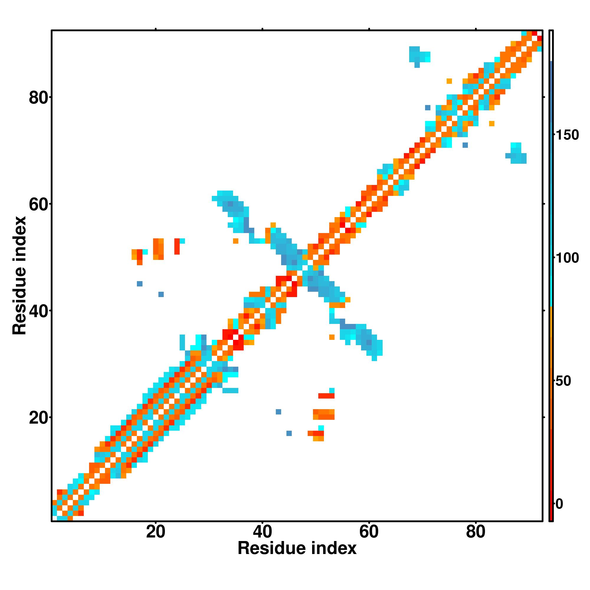 while for the distance map and hydrogen bond network, a color scale represents a distance of 1-20+ angstroms or a angle of 0-180 degree.