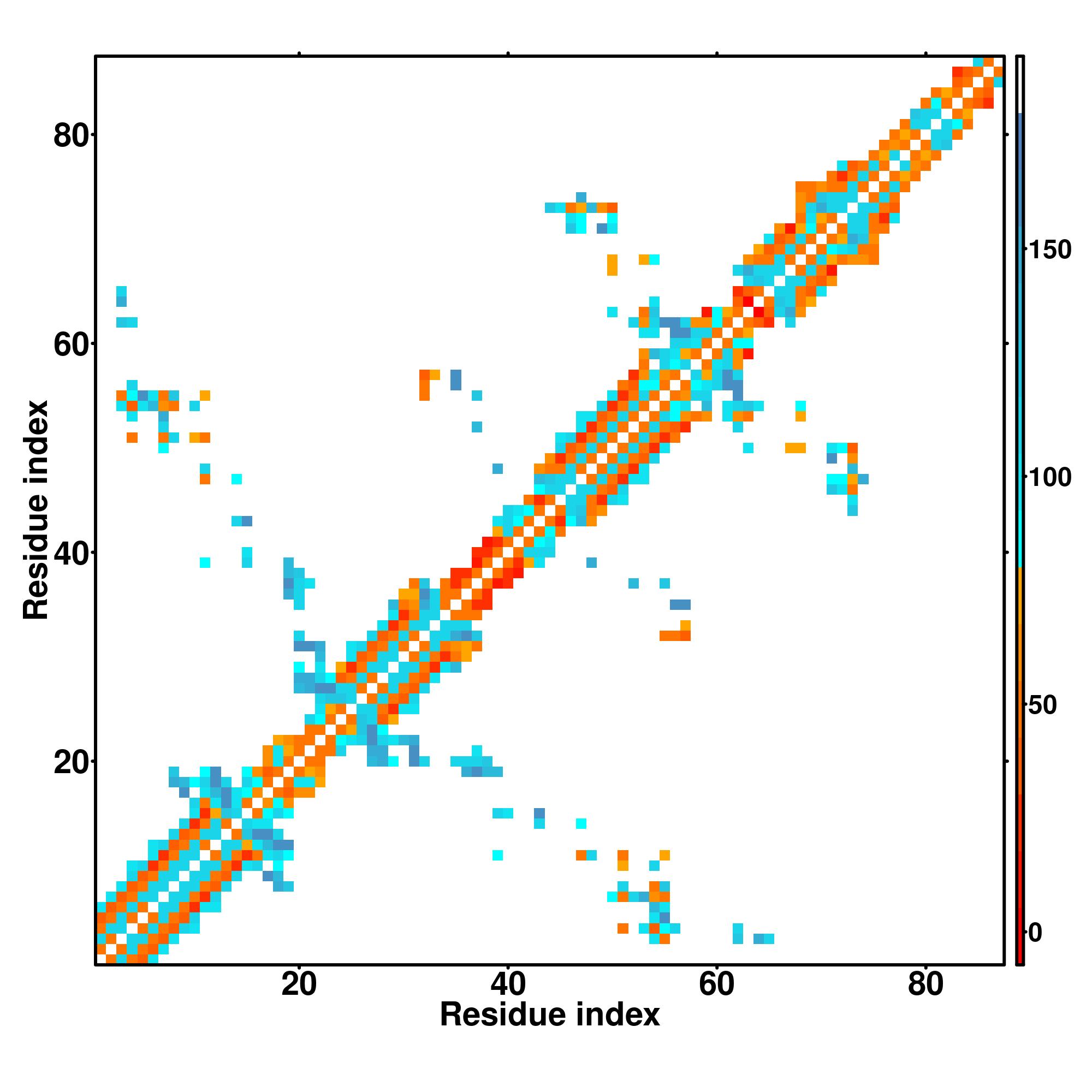 while for the distance map and hydrogen bond network, a color scale represents a distance of 1-20+ angstroms or a angle of 0-180 degree.