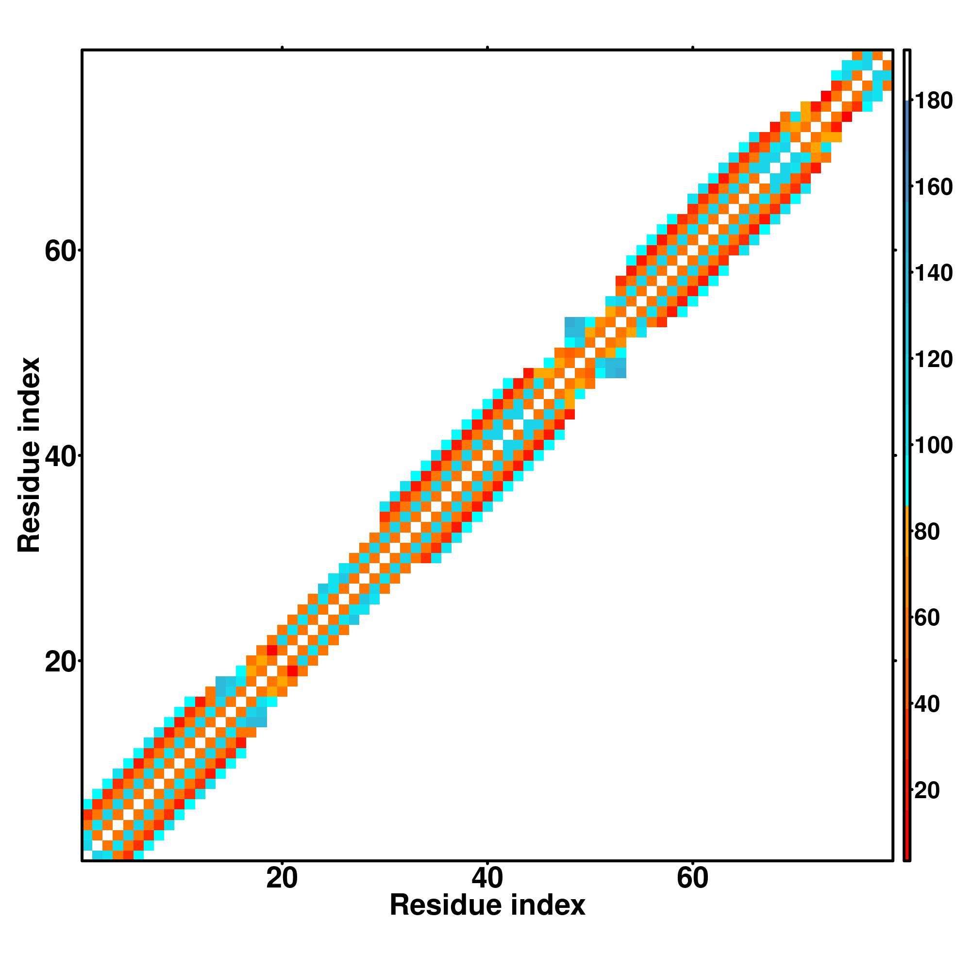 while for the distance map and hydrogen bond network, a color scale represents a distance of 1-20+ angstroms or a angle of 0-180 degree.