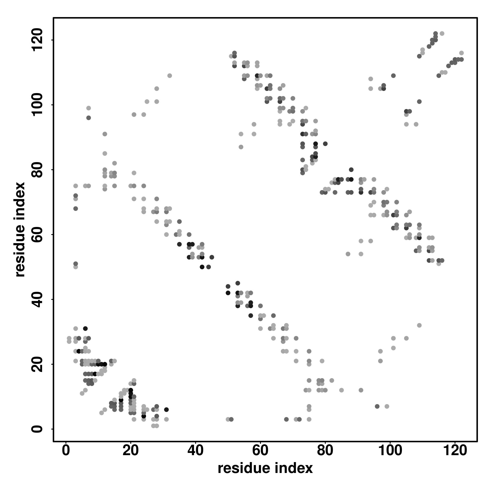 For the contact map, each dot represents a residue pair with predicted contact,