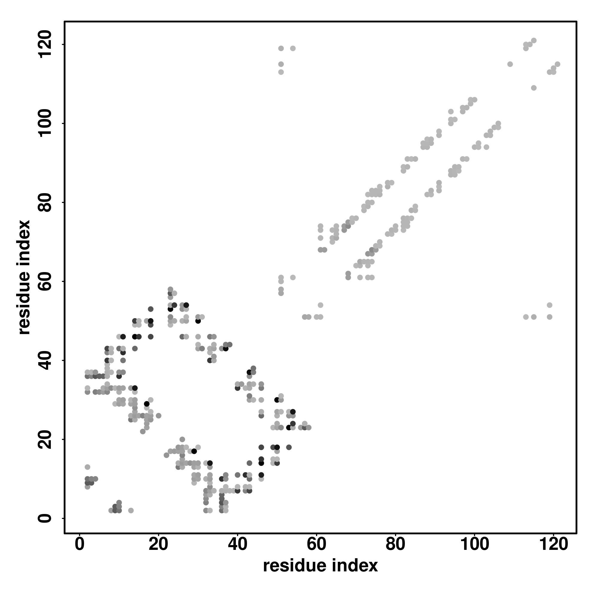 For the contact map, each dot represents a residue pair with predicted contact,