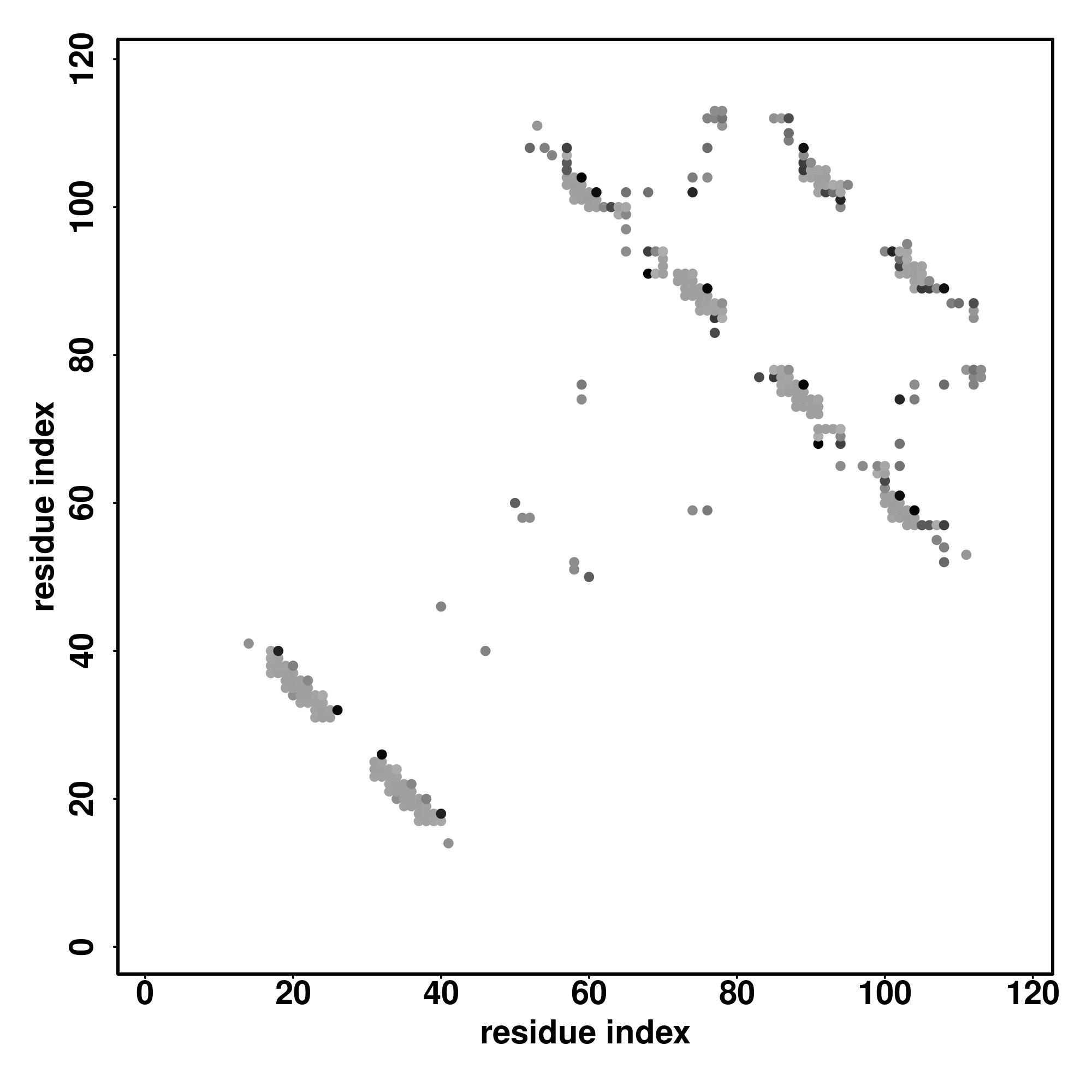 For the contact map, each dot represents a residue pair with predicted contact,