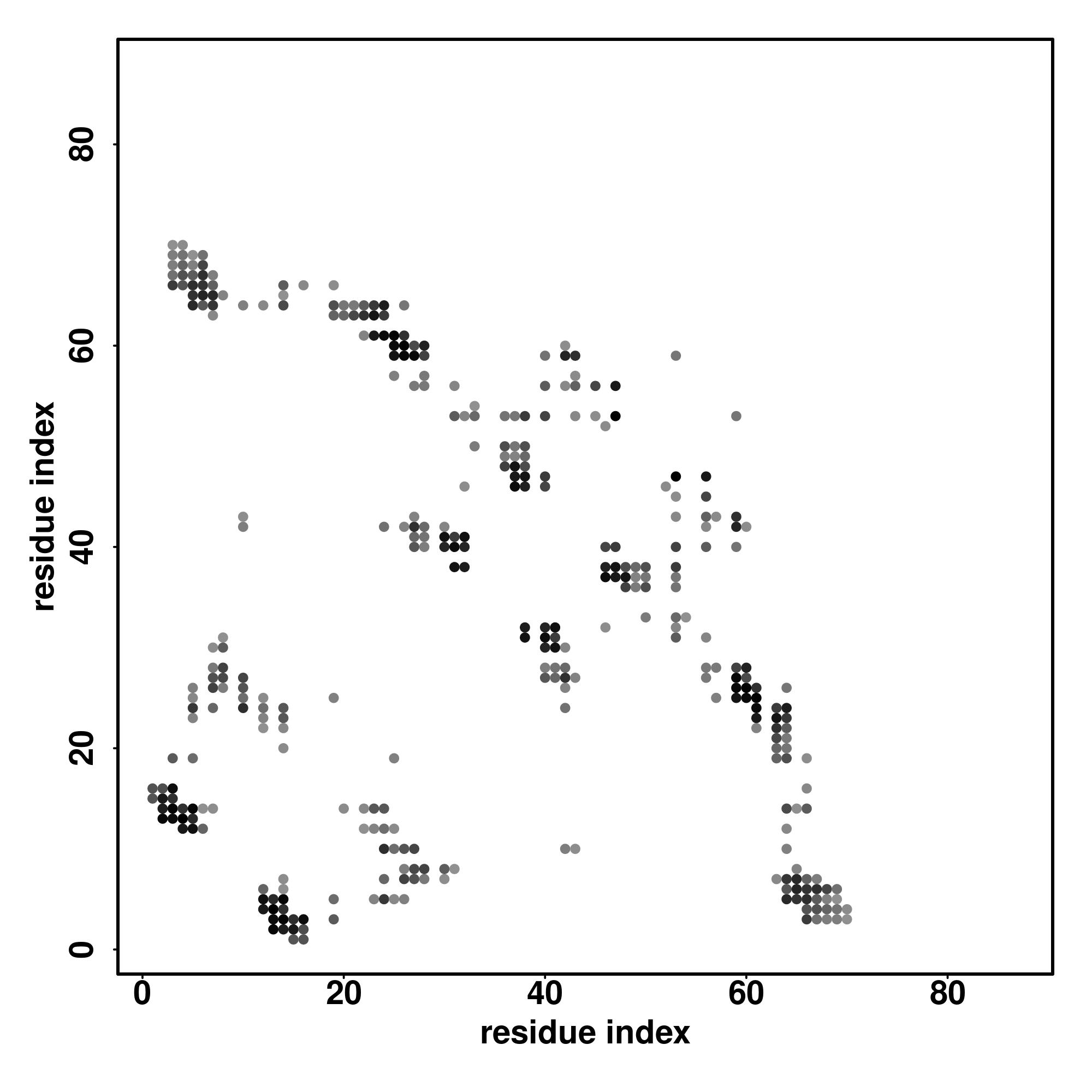 For the contact map, each dot represents a residue pair with predicted contact,