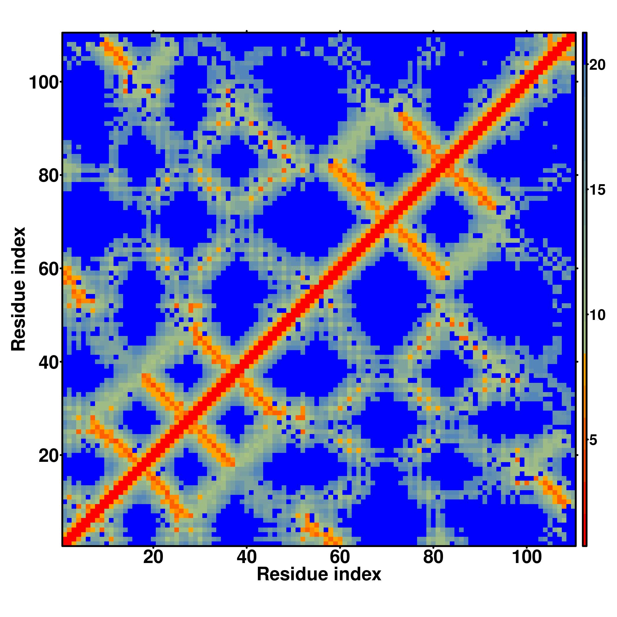 In the contact, distance map and hydrogen bond networks, the axes mark the residue index along the sequence.