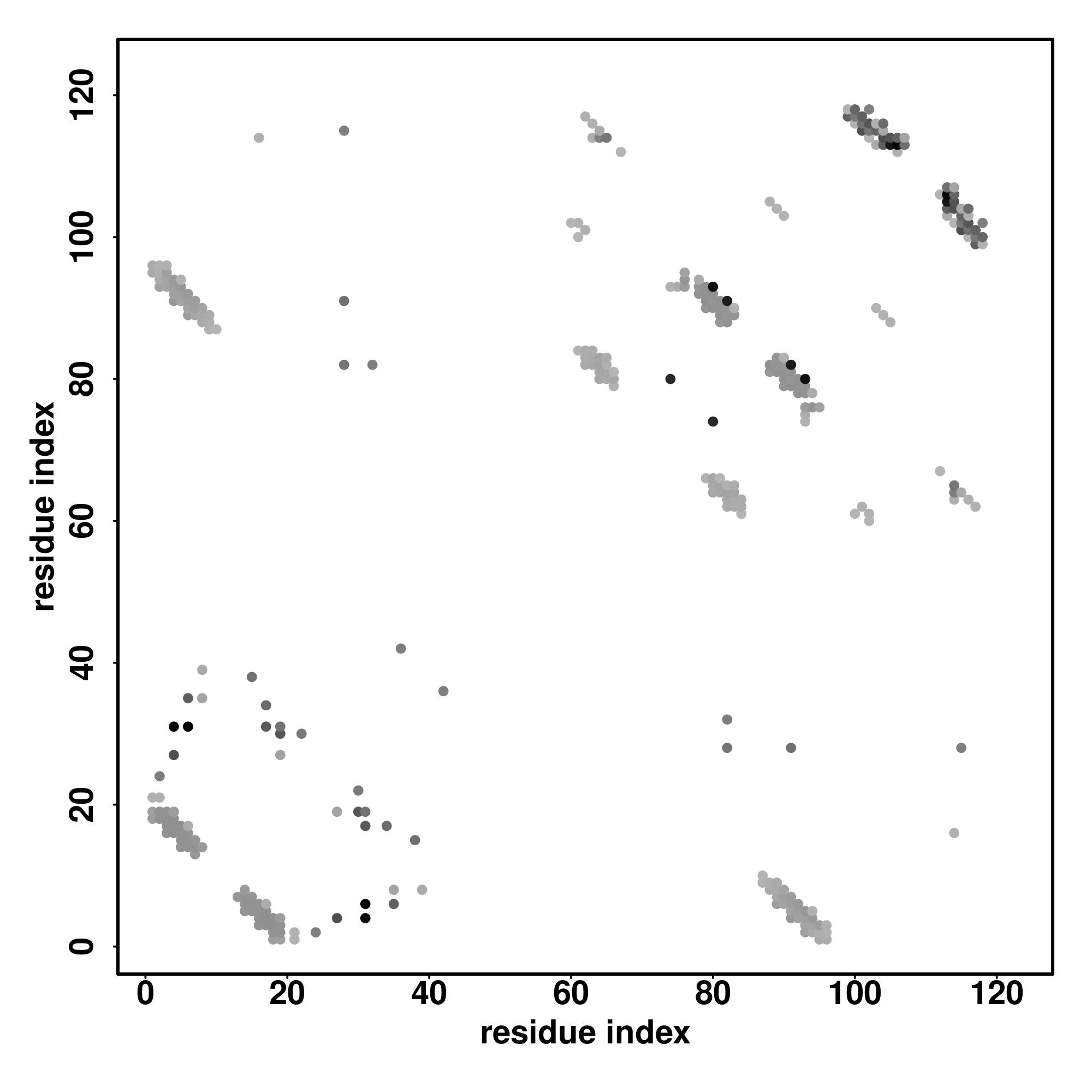 For the contact map, each dot represents a residue pair with predicted contact,