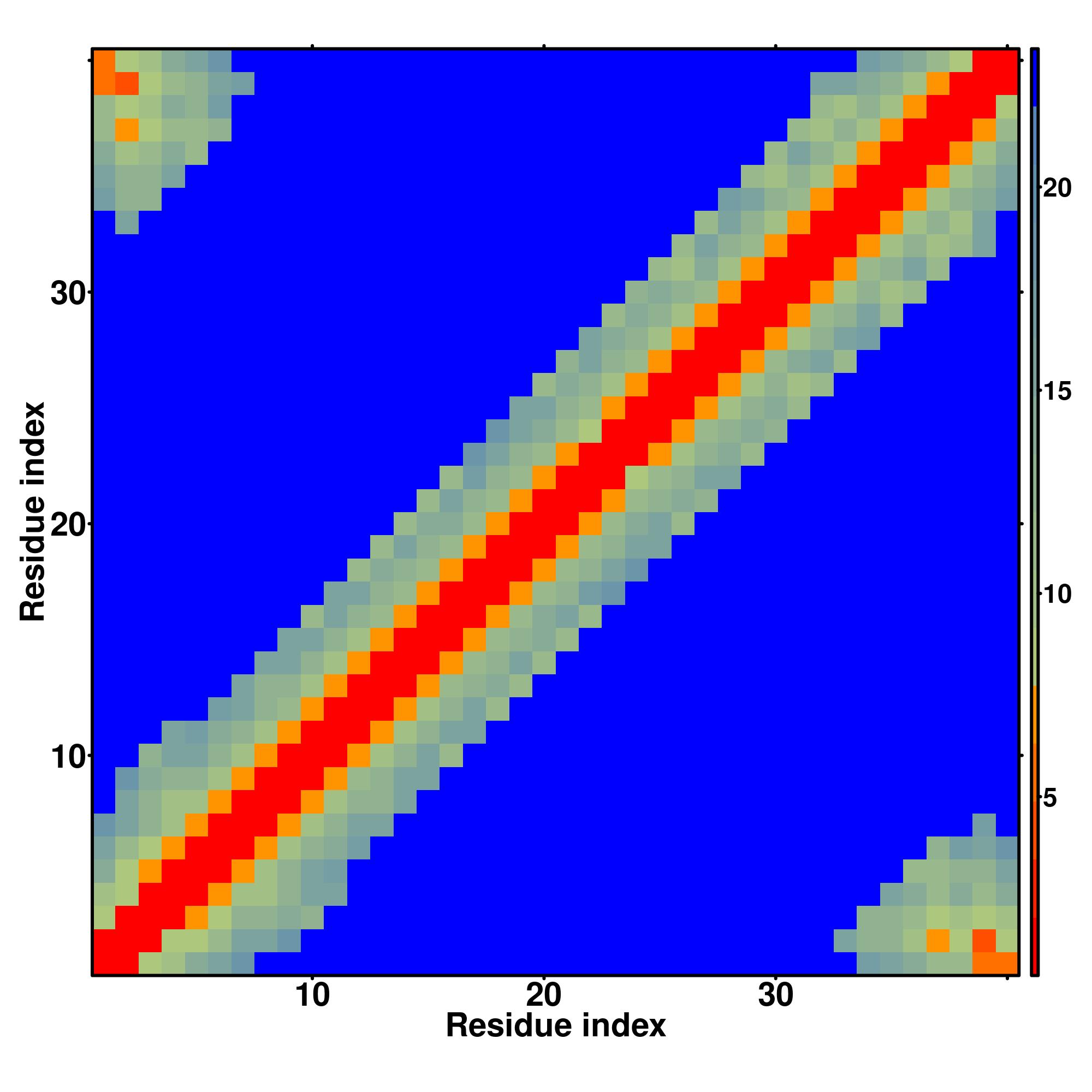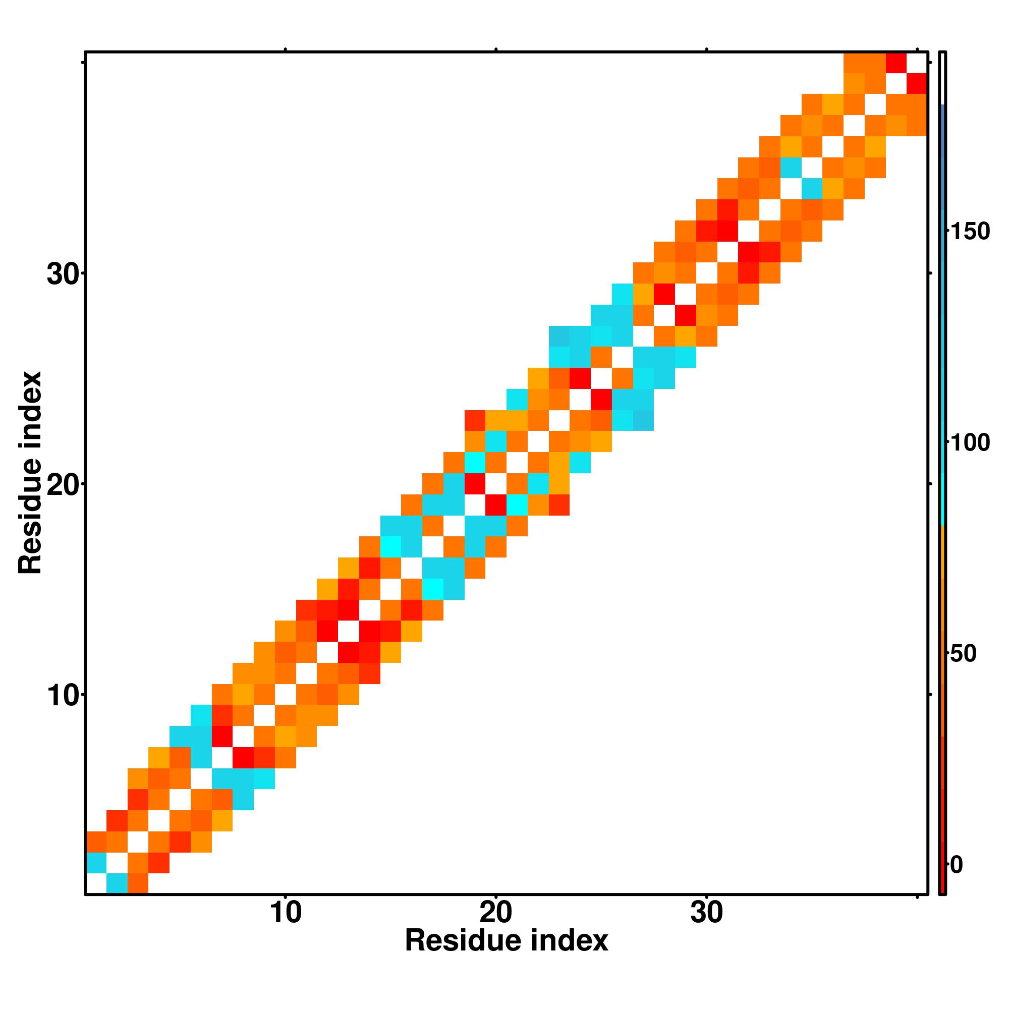 while for the distance map and hydrogen bond network, a color scale represents a distance of 1-20+ angstroms or a angle of 0-180 degree.