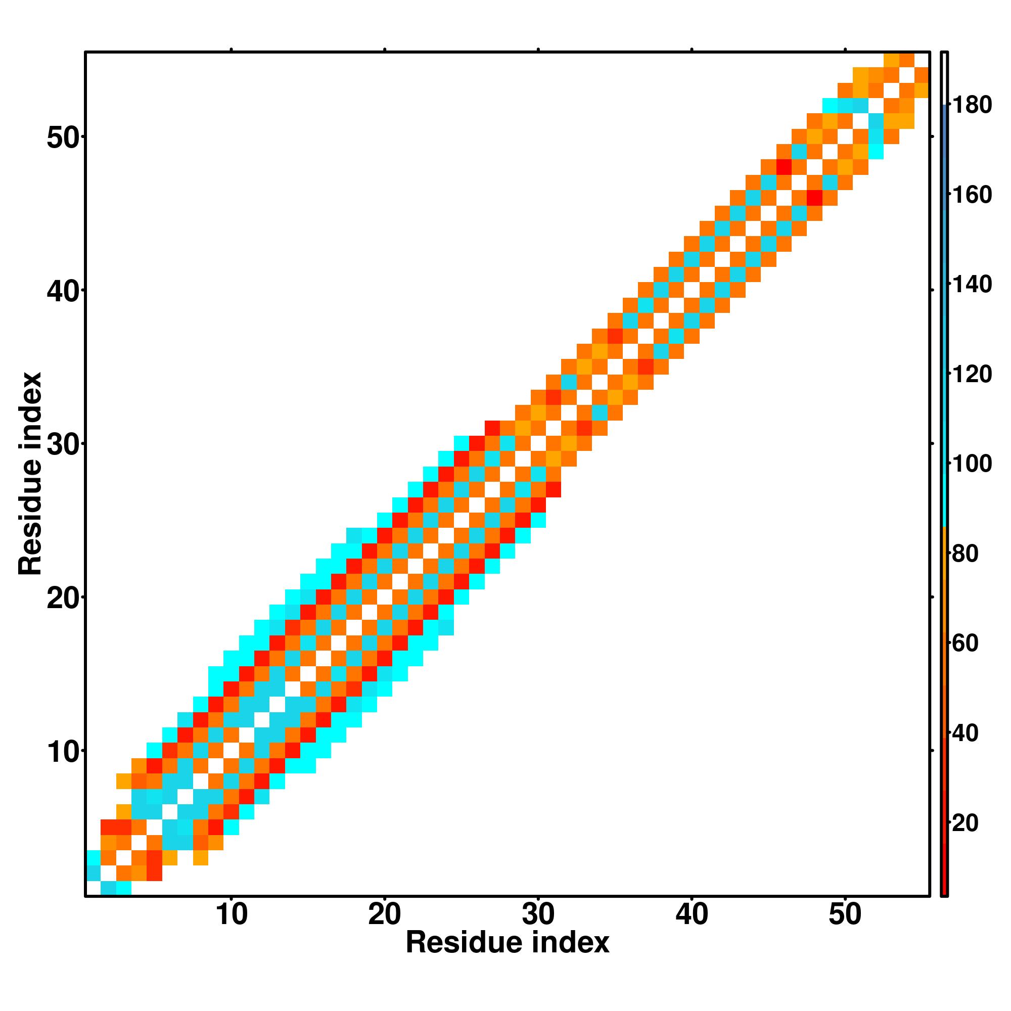 while for the distance map and hydrogen bond network, a color scale represents a distance of 1-20+ angstroms or a angle of 0-180 degree.