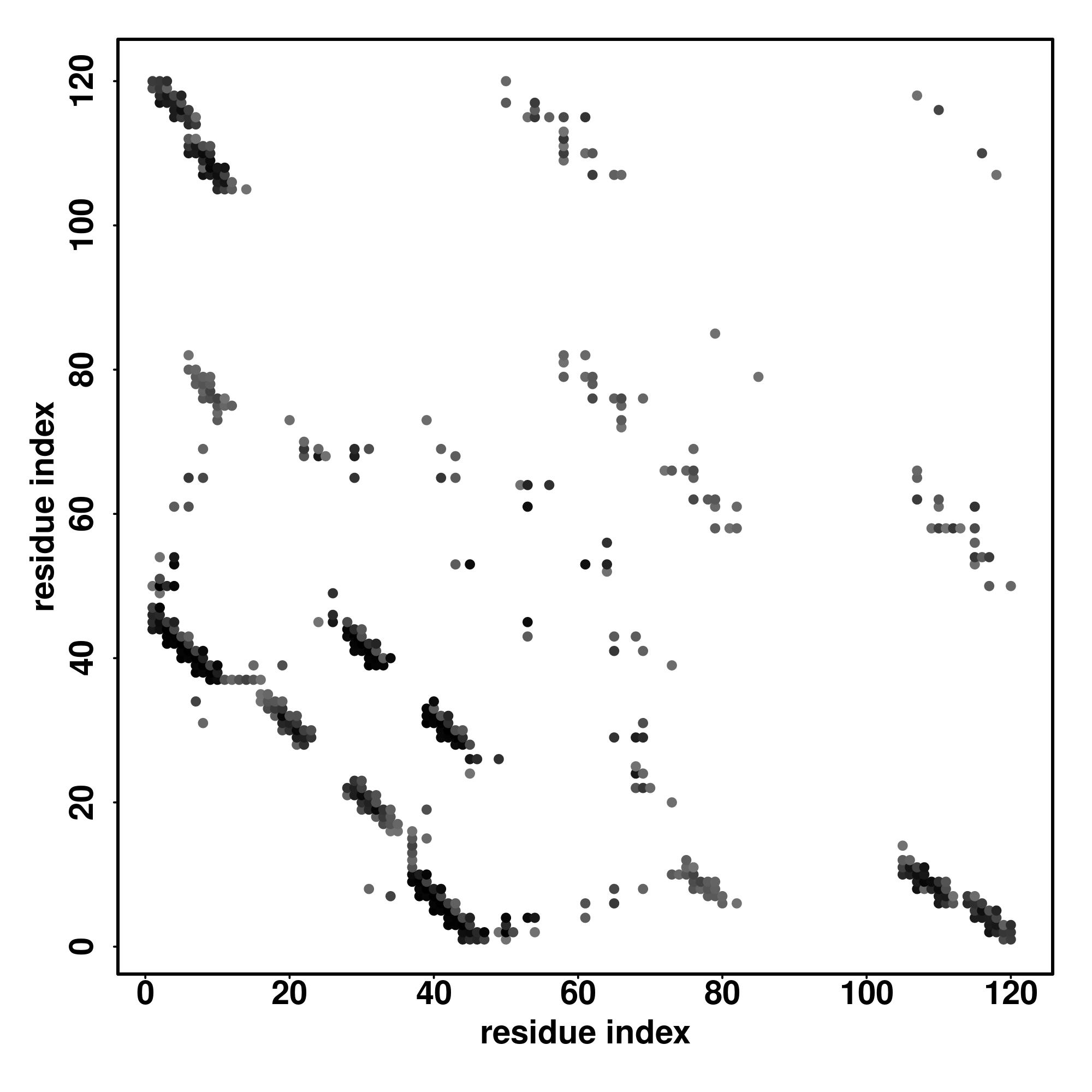 For the contact map, each dot represents a residue pair with predicted contact,