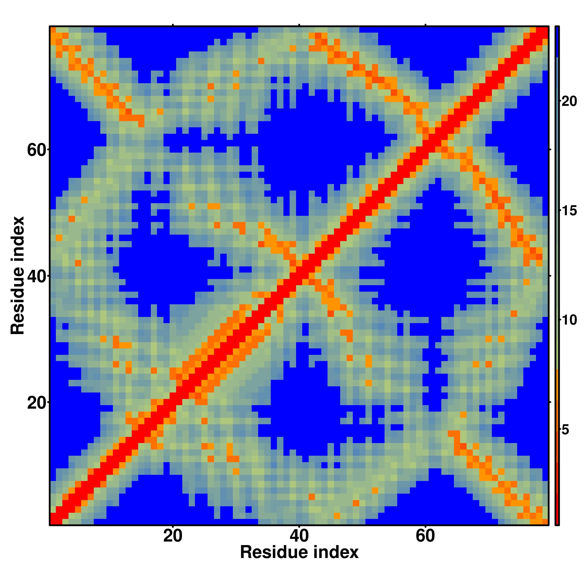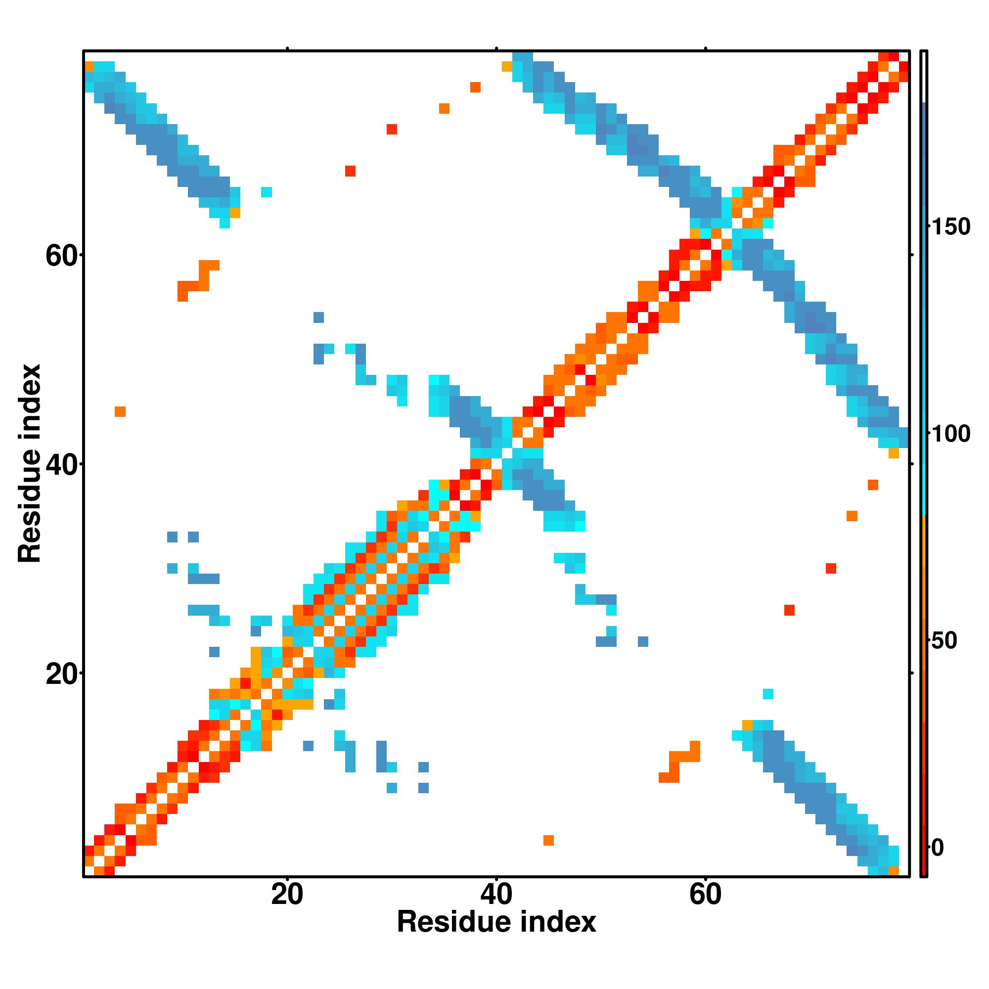 while for the distance map and hydrogen bond network, a color scale represents a distance of 1-20+ angstroms or a angle of 0-180 degree.