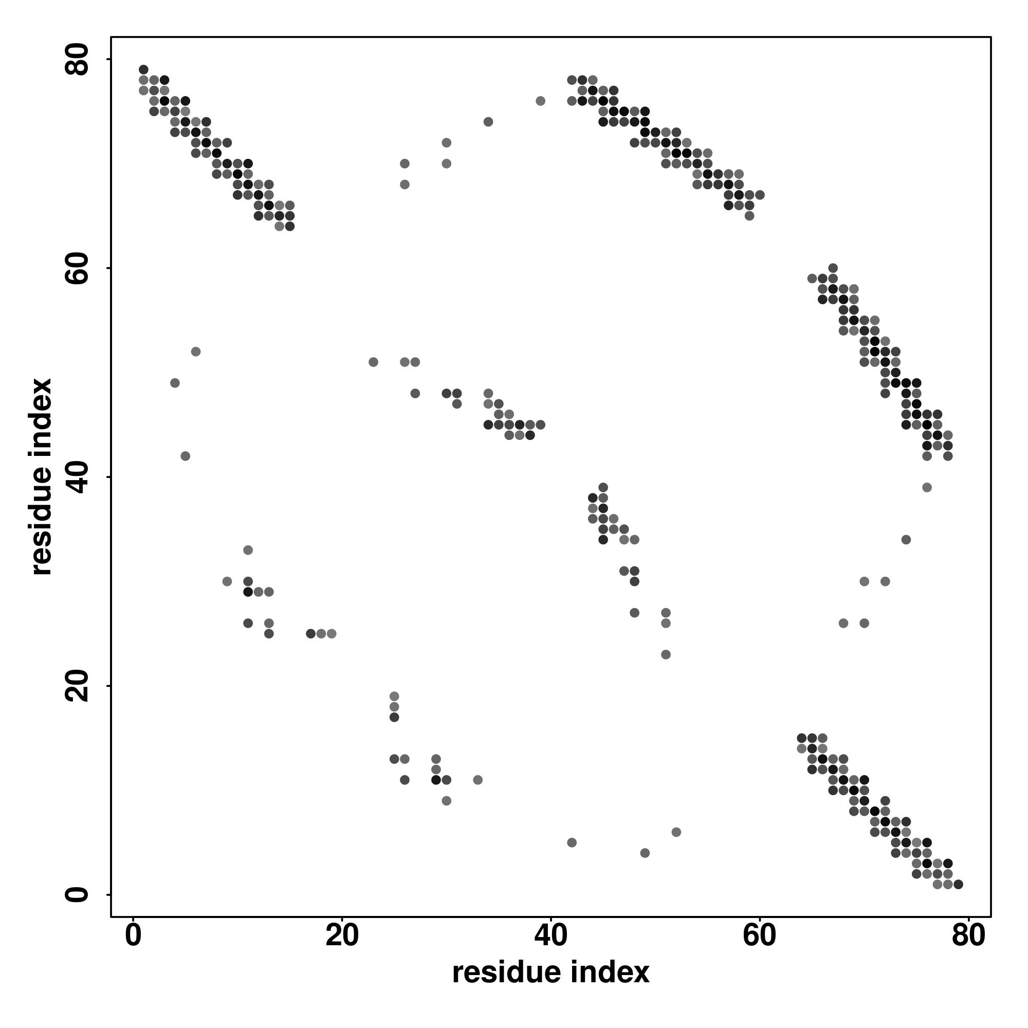 For the contact map, each dot represents a residue pair with predicted contact,