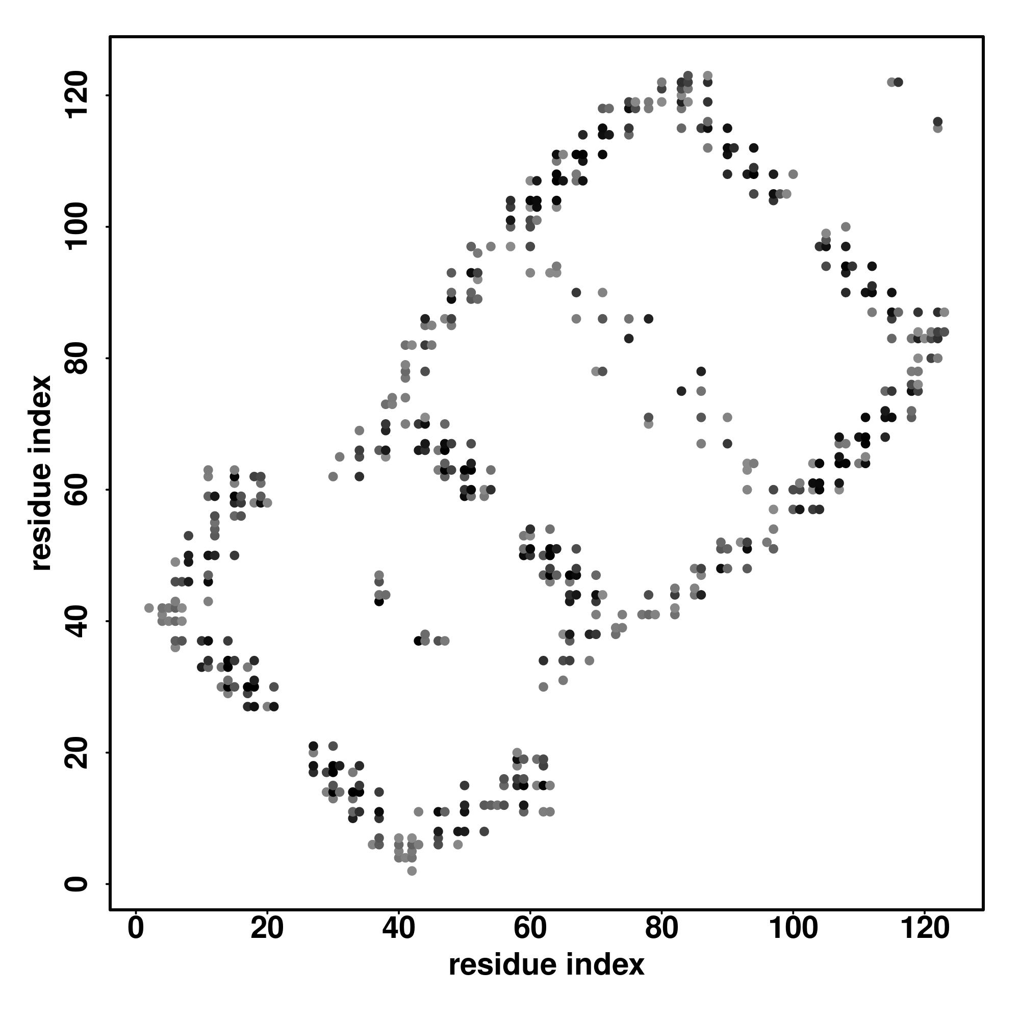For the contact map, each dot represents a residue pair with predicted contact,