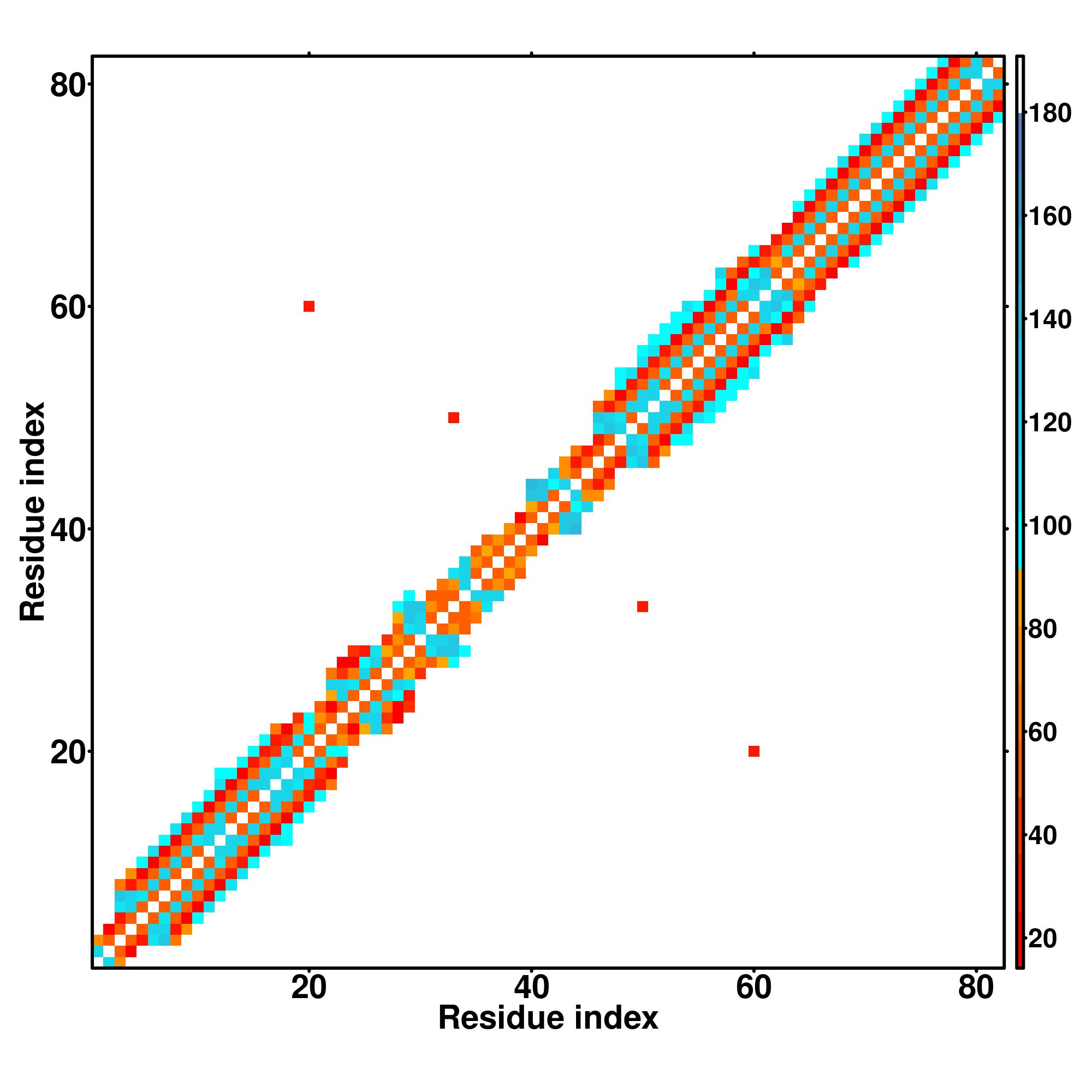 while for the distance map and hydrogen bond network, a color scale represents a distance of 1-20+ angstroms or a angle of 0-180 degree.